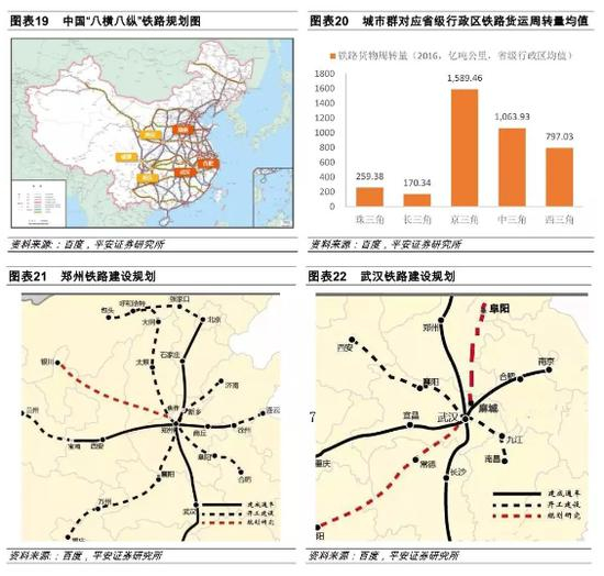在交通方面,五个城市群地理位置的差异和优势是非常显著的:京三角、长三角、珠三角位于沿海地区,都存在具备国际水平的港口群,成为中国对外开放和国际贸易的窗口。而中三角、西三角地处内陆,但其纵贯南北、连接东西的地理位置使其天然具备成为铁路交通枢纽的优势;尤其是中三角的郑州和武汉,在我国“八横八纵”的铁路规划中占据了重要地位。