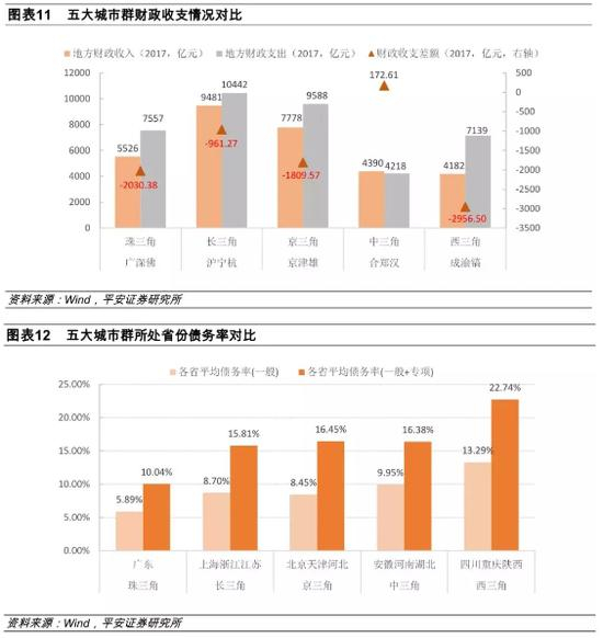 一个城市政府的收支与债务压力状况,能够从侧面反映该城市的经济发展状况(尤其是税收),同时也决定了其地方经济的调控空间及产业政策的支持力度。从财政收支规模看(2017年),五大城市群财政收支规模的状况与经济实力基本一致,长三角、京三角、珠三角排名靠前,西三角、中三角相对较低。除此之外还有几点特征:其一,京三角GDP与经济实力弱于珠三角,但财政收支均高于珠三角,这可能与京三角地区的企业总部注册数较多、税收征管水平较高、甚至房地产限购政策(五年社保及个税)有关;其二,西三角地区财政收入与中三角相当,但财政支出大幅高于中三角,主要是由于西三角城市中重庆的财政支出偏高造成;其三,除中三角有173亿元左右的收支盈余之外,其余城市群财政收支均有不同程度的缺口。