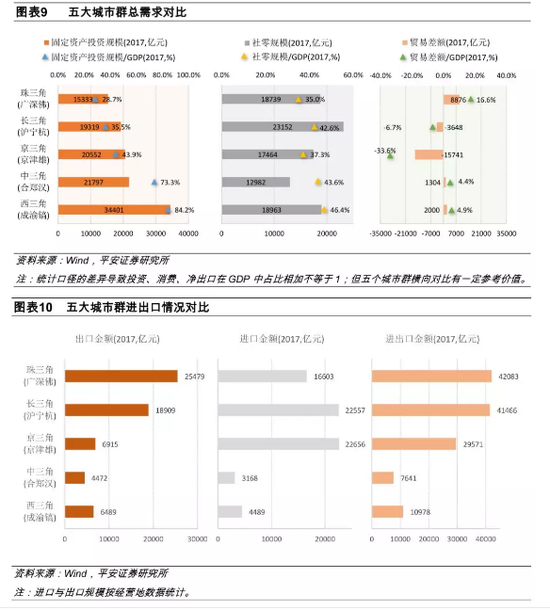 我们从投资、消费和净出口三个方面来考察五个城市三角的总需求结构,大致有如下结论: