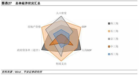 在经济总体状况方面,长三角综合经济实力最好,经济总量、财政支出、房价均排名第一,人口密度、人均GDP靠前,债务压力适中;珠三角次之,优势主要在于人均GDP所代表的经济增长效率和质量较好,另外政府债务压力较小;京三角各方面分化明显,政府支出规模较大,因而政策支持效率较高,但人口密度较大而平均房价较高,人均GDP显著偏低;中三角和西三角整体实力较前三个城市群有显著差距,西三角各方面均不突出,中三角优势在于人均GDP较高,政府债务压力较小。