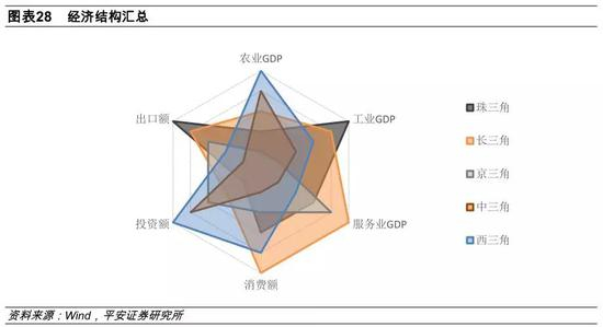 在经济结构方面,我们从生产端和需求端两个角度观察:长三角服务业与消费领先,珠三角工业与出口领先,京三角没有特别突出的优势,服务业相对靠前;西三角投资与农业领先,消费也较为靠前;中三角整体偏弱,经济结构与西三角有相似之处,投资与农业有相对优势。