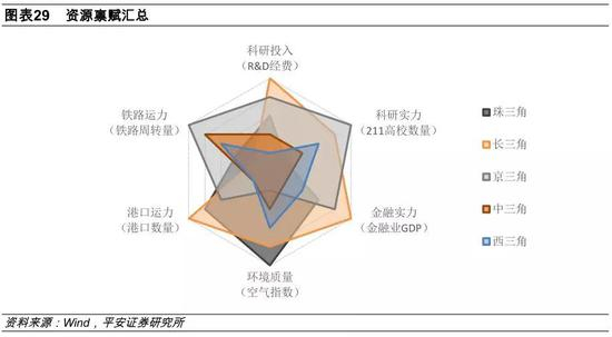 我们将前述的经济现状和资源禀赋指标进行总结排序,分三个方面总结五大城市群各自的核心优势,并通过雷达图进行对比分析。