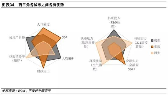西三角定位于研发融合。其以成都为金融中心,以重庆为制造业中心,以西安为研发中心。西三角则可以利用城市间优势资源互补的特征,推动核心城市的错位发展;并充分发挥本区域的教育资源优势,推动产学研的深度融合。
