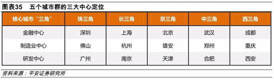 在每个城市群内部,都有一个金融中心、一个制造业中心和一个研发中心,使得城市群本身能够各有侧重、形成区域内协同发展的效应;而在五个城市群之间,由于其自身发展程度与优势资源的不同,也形成了各自独特的定位和发展方向: