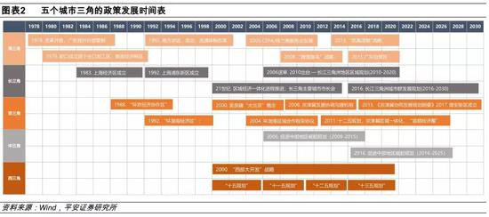 中国政府长期以来都有进行区域发展规划的惯例。改革开放以来,政府针对五个区域都曾出台过一系列的区域发展规划,以划定该地区未来一段时间的发展方向。我们首先总结1978年至今五大区域的相关政策规划文件,简单回顾五大城市群自改革开放至今的历史发展情况。