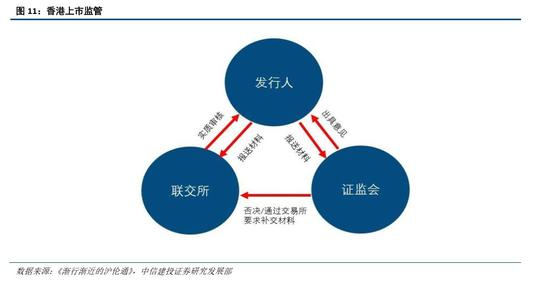 香港发行上市监管工作主要由香港证券及期货事务监察委员会(以下简称为香港证监会)和香港联交所负责。香港证监会有《证券及期货条例》赋予的调查和处分所有市场参与者的权力以保证香港的证券及期货市场的公平、效率和竞争性。香港证监会下设的企业融资部负责交易所与上市相关的工作、中介机构部负责中介人相关法规以及事宜、市场监察部负责市场运行监督、法规执行部负责监察执法。