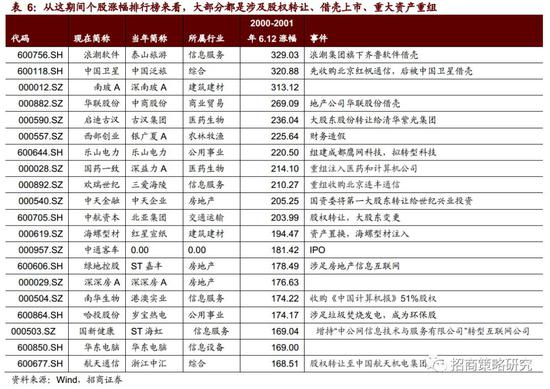 2000年开始,美国纳斯达克指数已经开始从高位回落,单纯的主题和概念投资已经很难再聚集人气。这时的背景是2000年,正好是国企改革三年攻坚战的最后一年,股权运作事件成为驱动市场的核心。从这期间涨幅排行榜来看,大部分都是涉及股权转让、借壳上市、重大资产重组。