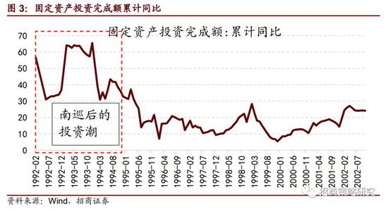 1992年初,邓小平先后赴武昌、深圳、珠海和上海视察,沿途发表了重要谈话,历史上称为“南巡”。南巡是改革开放中途非常重要的一个事件,推动了改革开放向纵深推动,也极大的鼓舞了人心。南巡后,全国人民大干快上,到1992年年底,固定资产投资增速超过了60%,一直到1995均保持在20%增速以上。