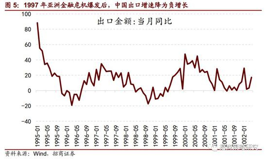 祸不单行,在确立内部国企改革三年目标准备好去产能的档口,1997年亚洲金融危机爆发。全球经济同步陷入低迷。1997年开始,中国出口增速一路下滑,到1998年开始变成了负增长。中国经济遭遇了雪上加霜。