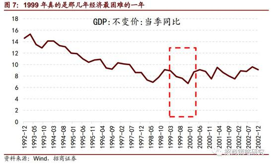 我们打开中国GDP的历史增速图,我们会发现以1999年作为中心,前后各两年,加起来一共5年,是中国经济在1992年邓小平南巡后,以及加入wto中国经济再度崛起之前中间调整的5年。