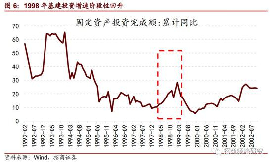 1998年应该是非常艰难的一年,不仅国内开始国企改革,下岗再就业,外部需求萎缩,天公也不作美。1998年发生了百年一遇的特大洪水。在这样的艰难环境下,全国人大常务委员会通过决议,增发1000亿元国债,配套1000亿元银行贷款,以扩大内需,加快基础设施建设。1998年至1999年,固定投资完成额明显反弹,主要是靠基建投资拉动。