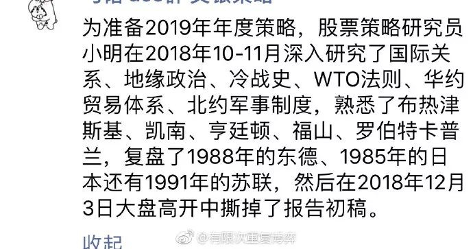 有段子这么说,为了准备2019年年度策略,已经没有新财富奖金的策略分析师小明,在2018年10-11月深入研究了国际关系、地缘政治、冷战史、WTO法则、华约贸易体系、北约军事制度,熟悉了布热津斯基、凯南、亨廷顿、福山、罗伯特卡普兰,复盘了1988年的东德、1985年的日本还有1991年的苏联,然后在2018年12月3日的大盘高开中撕掉了报告初稿。