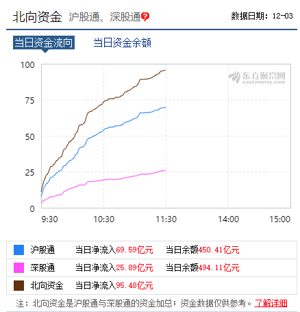 沪深港通方面,港资疯狂涌入,上午北向资金流入近100亿。随着两市股指大幅攀升,北上资金再次大幅净流入。截至午间收盘,北上资金净流入95.48亿元,其中,沪股通净流入69.59亿元,深股通净流入25.89亿元。