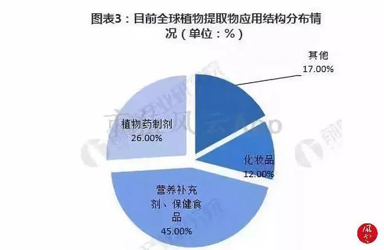 而就在这日渐成长的行业中,受益于世界范围内“回归自然”呼声不断升温,植物提取物越来越受到医药界、食品界的关注,营养补充剂和保健食品成为植物提取物的最大需求市场,2017年,该部分市场占比已经达到45%,其次为植物药制剂,占比为26%,化妆品占比12%。