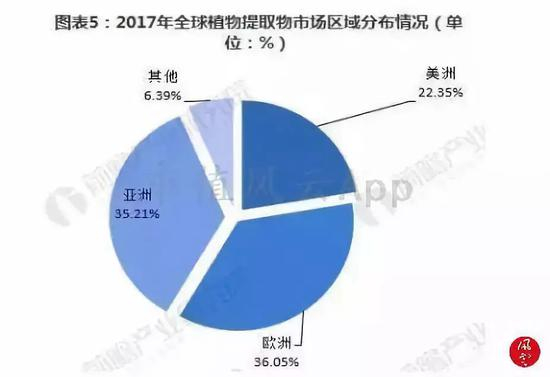 而且在市场地域分布上,已经形成亚洲和欧洲占主导的局面。从下图可知,2017年,全球植物提取物市场欧洲占比最大,为36.5%,其次为亚洲,占比35.21%,亚欧合计占比已达71.26%。