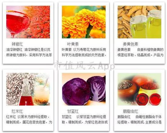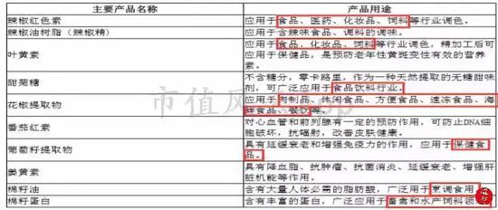 根据类别,公司已经从原来单一的辣椒红、辣椒精品种已经扩充到天然色素、天然香辛料提取物和精油、天然营养及药用提取物、油脂和蛋白等四大类及80多个品种,主要包括:
