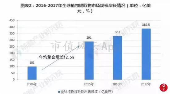 根据前瞻产业研究院的统计,2016-2017年,植物提取物行业全球市场规模呈不断上升趋势,2017年全球植物提取物销售额达389.5亿美元,同比增长16.97%,年均市场发展速度约为12.5%。该行业仍然属于处于成长期。
