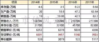 但,通过对存货价值(仅指库存商品)分析,发现在公司近年来产品销售单价持续下降的情况下,公司以历史成本计量的存货单价却大量增加,而且一直都高于销售单价,2015年和2017年,二者单价差异居然在3000元-5000元/吨左右。