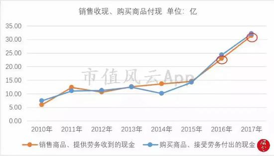 根据公司在投资者关系活动纪要中的解释是,公司在第4季度进行大量集中采购所致。而仔细看,恰好业绩表现良好的2016年和2017年,购买商品接受劳务付出的现金明显要比销售收到的现金高。