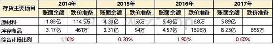 在如此高昂的存货构成中,占比较高的就是原材料和库存商品,经整理,面对几个亿的存货,相应地,存货跌价准备的计提比例仅在0.2%-1.9%左右。
