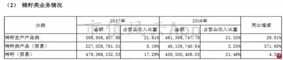 2017年年报,对分产品的收入又进行了一次统计口径调整,棉籽类业务收入上年可比数据为9.69亿,具体包括棉籽产品类收入、棉籽贸易收入。