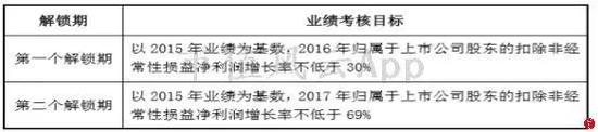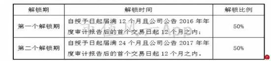 整个激励以2015年的0.5亿扣非净利润业绩为基数,对2016年和2017年的扣非净利润增长率指标进行考核,要求分别增长至少30%、69%以上,达到业绩条件后,激励对象可在未来24个月内分两期解锁,每期各解锁50%。