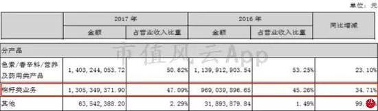 按照此分类依据,可以大概推测,2016年归类于“其他业务收入”的产品收入,包含在2017年被重新调整计入的棉籽类业务和其他产品中。所以,2016年的“其他业务收入”主要是棉籽类贸易收入。当年营收13亿,占比达47%,同比增加34.71%。