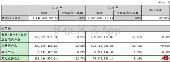 据年报资料显示,公司植提类产品(即:色素/香辛料/营养及药用类产品)、棉籽类产品、其他产品的合计营业收入,仅同比增长39%,公司当年营收大跨步增长的主要原因是“其他业务收入”突然从上年的7847万增加至4.86亿,同比增长519%。