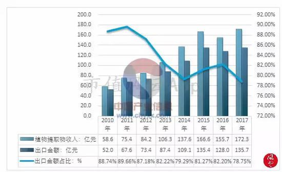 因此,出口成为带动行业发展的主要方式。据公开资料显示,我国植物提取物行业出口额占行业总收入的80%以上。