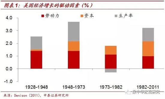 按照经典的经济学理论,长期经济增长是由生产要素决定的,劳动力、资本、技术等生产要素共同影响长期经济增长。美国1929-2011年间GDP年化增长3.02%,其中1.23%来自劳动力贡献,0.74%来自资本,1.04%来自生产率提高。