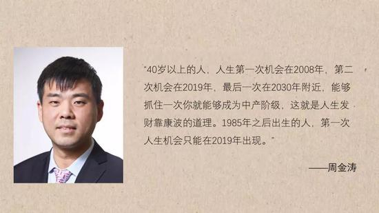 40岁以上的人,人生第一次机会在2008年,第二次机会在2019年,最后一次在2030年附近,能够抓住一次你就能够成为中产阶级;