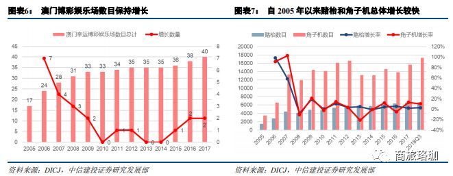 澳门博彩业发展迅猛,赌场及赌枱、角子机数量快速提升。随着澳门博彩合法化,同时2005年,六大博彩牌照确定后,澳门博彩业迎来了较快的发展,博彩娱乐场数量由2005年的17座增加到2018年Q3的41座,赌枱数量由2005年的1391台增加至2018年Q3的6598台,角子机数量由2005年的3421台增至2018年Q3的17218台。