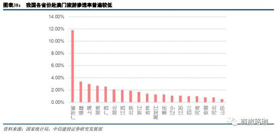 我国各省份目前赴澳门旅游的渗透率普遍较低,东南沿海也仅广东较高,超过10%,其他均不到4%。参考美国赌城拉斯维加斯,美国旅客赴拉斯维加斯的渗透率达到约11%,而中国澳门这一比例不到3%,故而澳门作为国内唯一可合法经营博彩的城市,仍具有较大的吸引旅客的空间。普通赴澳旅客随着消费的提升,预计转化为普通中场业务消费者的可能性较大。