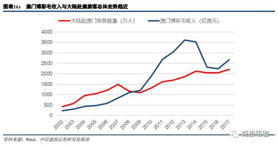 澳门博彩业的复苏从需求端看与大陆赴澳门旅客的数量自2016年开始反弹并加速提升有关。其原因主要是2016-2017年国内经济状况企稳,新的增长模式逐渐确立。同时结构性消费升级趋势明显,三四线城市开始普遍进入出境游需求增长较快的时期,原先出境游消费能力较低的群体,消费需求也有所提升,导致对于博彩行业乃至高端中场业务的需求有所提升。