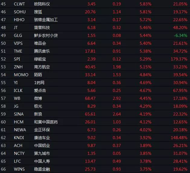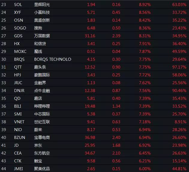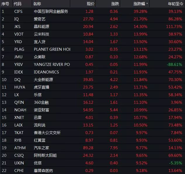 圣盈信涨超39%,爱奇艺收涨21.7%,宜人贷涨超13%,虎牙涨超11%,迅雷、流利说涨超10%,红黄蓝涨超9%,搜狗涨超8%,趣头条、哔哩哔哩涨超7%,宝尊电商、京东大涨近7%,唯品会上涨5.4%,新浪上涨4.19%,阿里巴巴上涨3.06%。