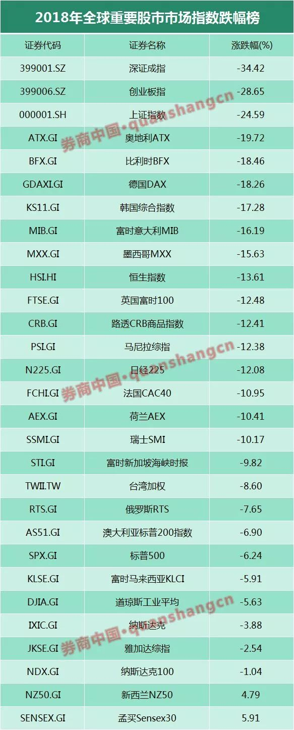 深证成指、创业板指、上证指数分别以34.42%、28.65%和24.59%的跌幅,位居跌幅榜前三位。