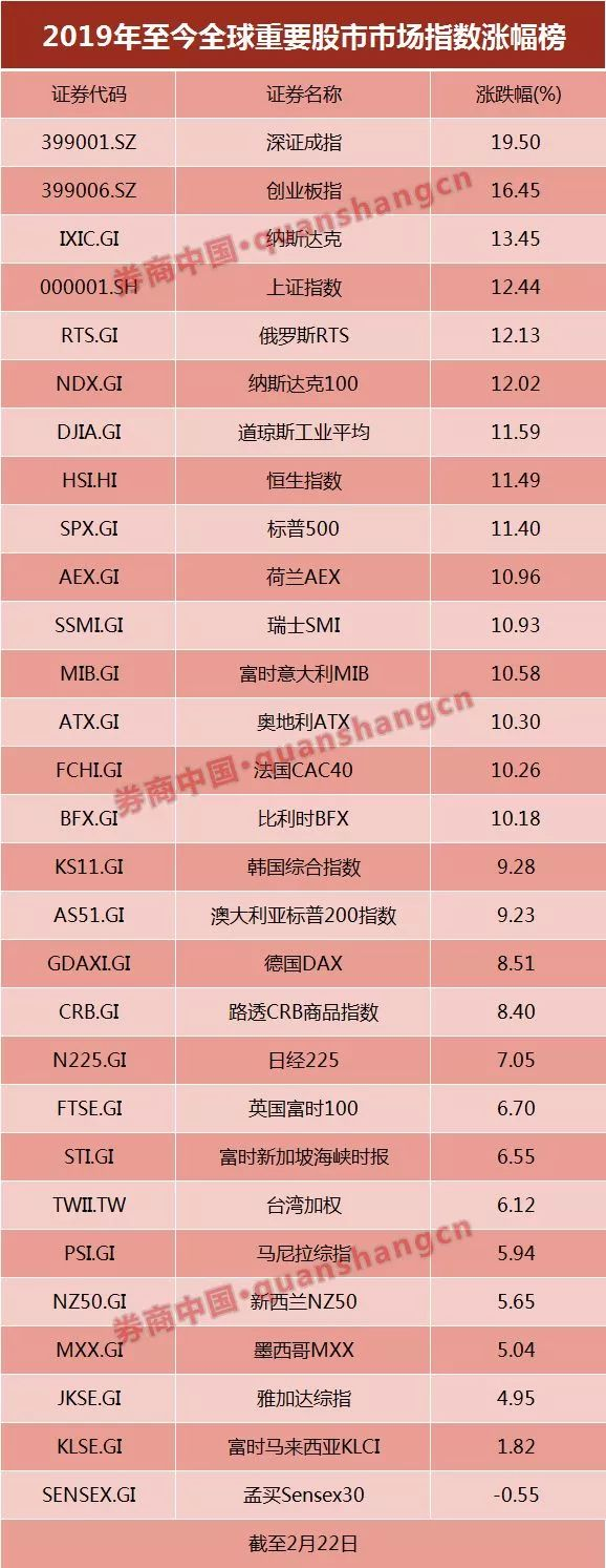 从全球范围来看,29个关键指数中,仅孟买Sensex30年内(1月1日至2月22日)出现下跌,不过跌幅仅0.55%,其余28个指数均实现上涨。