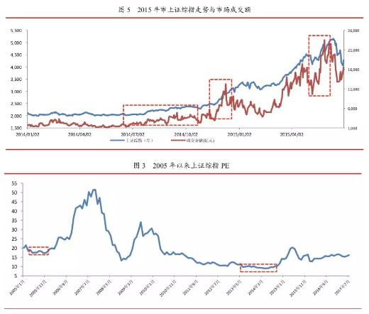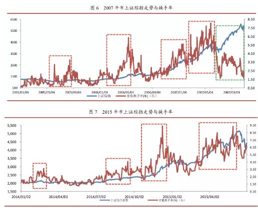 牛市后期,市场交易额持续放大并保持高位运行,市场成交额先于上证综指见顶。从图4、图5中可以看到,在牛市后期,随着更多的投资者参与到市场交易之中,市场活跃度较高,市场交易额持续放大并保持高位运行。另外,从图4、图5中也可以看到,2007和2015牛市的成交额均先于上证综指见顶,表明成交额是股指持续上涨的重要支撑。而成交额在牛市后期达到天量高点后开始回落,可看作是牛市缺乏继续上行动力的标志之一。