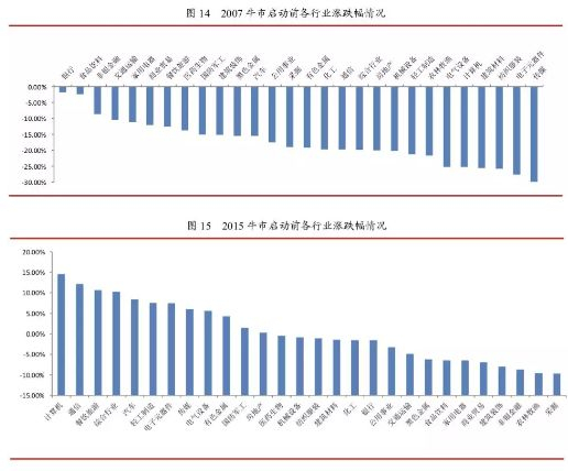 2005年1月-5月和2014年1月-6月的两次牛市启动前,各板块涨幅都不明显,且超过半数的板块都处于下跌状态。如图14所示,2007牛市启动前无行业实现上涨,其中银行、非银金融、食品饮料以及建筑装饰等行业跌幅较小;2015牛市启动前大部分行业下跌,如图15所示,上涨的行业仅有12个,其中计算机、通信、电子元器件以及传媒等行业涨幅靠前。