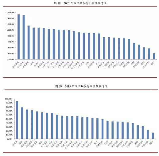 根据前面对于牛市不同时期的划分,分别计算2007牛市和2015牛市中28个申万一级行业在每个时期的涨跌情况,并对涨幅靠前和靠后的行业进行比较分析,得出在牛市不同阶段的行业变化情况,据此分析牛市的阶段性特征。