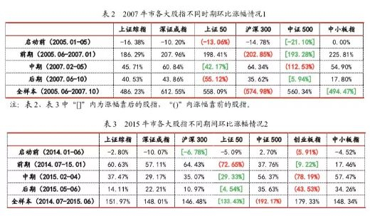 根据上述对于牛市不同阶段的划分,将2007和2015牛市不同时期各大股指的环比涨幅情况进行计算分别得到表2、表3。从表2、表3中可以看到,牛市中各大股票指数普涨,且涨幅较大,一般至少可达到100%以上。在表2、表3中,分别将上证50、沪深300、中证500、中小板指以及创业板指进行相互比较,阶段性环比涨幅靠前的指数用红色标出,阶段环比涨幅靠后的用绿色标出。值得注意的是,由于中小扳指从2005年6月7日才开始启用,其在2007牛市前期的涨幅靠前并不能有效反映当时市场实际情况,因而应将其剔除掉。