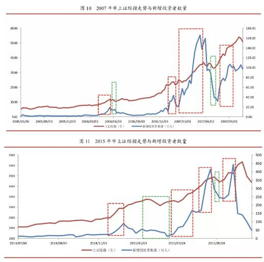 新增投资者数量与上证综指间具有正相关关系。从图10、图11中可以明显看到,随着投资者数量增加速度加快,上证综指出现明显上涨,在牛市后期这种现象尤为明显。而随着新增投资者数量增加速度的下降,上证综指则对应出现下跌趋势。这种现象主要与A股市场的交易由散户主导、交易的投机性较强的结构特征有关。