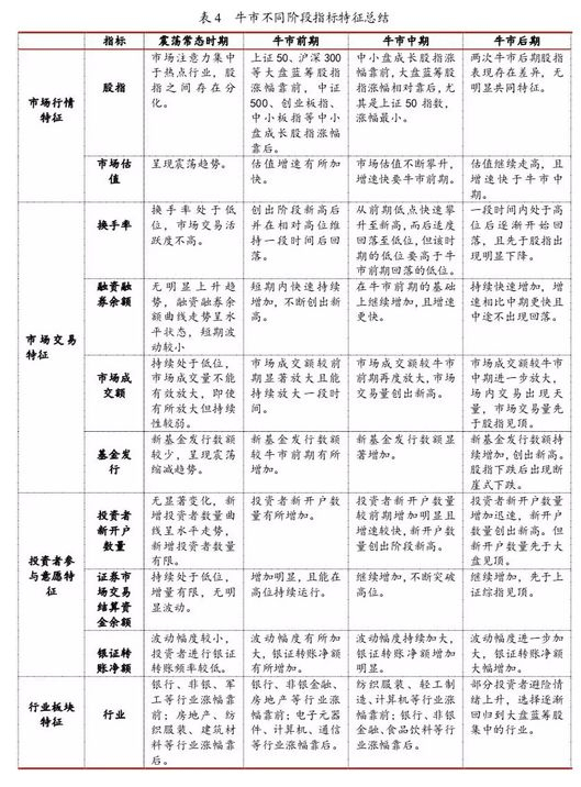 如前所述,在牛市的不同阶段,各类指标呈现出不同的特点,表4对此进行了梳理归纳。表4的这些指标变动可为投资者判断牛市所处的阶段和制定具体的投资决策提供一些有用信息。