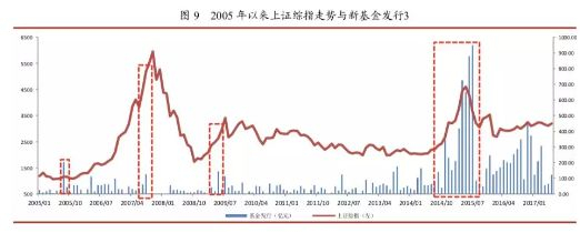 新发行基金数额较震荡常态期间显著增加可视为牛市启动的一个标志。从图9中可以看到,随着新发行基金数额增加,上证综指出现明显上涨,可见新发行的基金对于上证综指的走势具有重要影响。在牛市前期,新发行的基金数额明显高于之前的震荡市中发行的数额,在2007牛市中表现的尤为明显。随着牛市结束,市场进入熊市,新基金发行出现断崖式下跌。