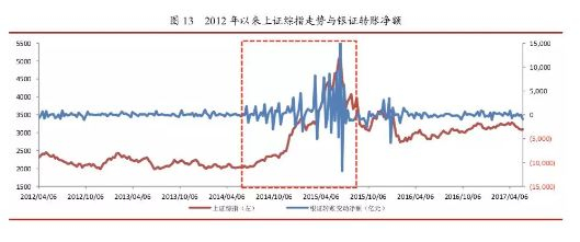 牛市中,银行转账变动净额波动幅度加大,银证转账变动幅度持续放大可能是牛市启动的标志之一。从图13中可以看出,随着上证综指不断走高,银证转账的波动幅度也持续加大,表明投资者资金在银行和证券账户之间转换频繁和转账数额逐步增加,从而更多的资金进入到股市之中,助推股指上行。另外,从图13中也可以看到,随着银证转账净额的大幅减少,上证综指出现下跌。因而,可将银证转账净额的大幅减少作为股指下跌的先行指标之一。