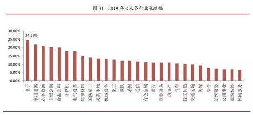 最后,从行业板块层面来看,28个申万一级行业均呈现上涨态势,成长与价值股集中的行业均表现较好。如图31所示,2019以来,电子、家用电器、农林牧渔、非银金融、食品饮料等行业涨幅靠前,纺织服装、综合、公用事业、建筑装饰、休闲服务等行业涨幅靠后。其中,由于农林牧渔行业的周期性特征,此处将其从涨幅靠前的行业中剔除,则成长股集中的电子行业涨幅最大为24.59%,价值蓝筹股集中的家用电器、非银金融以及食品饮料等行业涨幅均接近或超过20%,作为牛市先行指标的非银金融行业涨幅为20.25%。此外,另一成长股集中的计算机行业涨幅位于第五位(剔除农林牧渔行业后),且今年以来的涨幅为17.88%。从行业板块来看,2019年以价值蓝筹股与成长股集中的行业均涨幅靠前,分化并不显著,这与牛市前期行业涨幅分化的特征并不符合。但值得注意的一点是,作为牛市先行指标的非银金融行业,今年以来涨幅居前,但到目前其涨幅仍相对有限。同样由于观察的时间窗口太短,需要做进一步的观察,如果未来一段时间内非银金融行业能够进一步大幅度上涨,则市场有可能进一步上行。