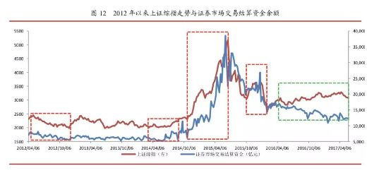 牛市过程中伴随着证券市场交易结算资金余额的持续走高,而证券市场交易结算资金余额先于上证综指见顶。从图12中可以看到,随着上证综指不断走高,证券市场交易结算资金余额也不断攀升。此外,从图中也可以看到,证券市场交易结算资金余额先于上证综指见顶,证券市场交易结算资金余额在短时间内从阶段高位快速降低后,上证综指也会出现较大幅度的下跌。因此,可将证券市场交易结算资金余额在高位快速下跌作为股指走低的前兆之一。
