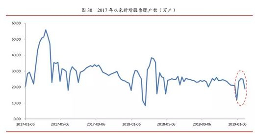 再次,从投资者参与意愿来看,投资者参与意愿依然不足。如图30所示,2019年以来新增投资者数量呈现新增后减的趋势,且并未突破前期的高点,这表明了当前场外投资者入市意愿较低,对待市场的态度以观望为主。但可以预计的一点是,随着近期市场行情回暖、内部政策趋向温和以及外部条件向乐观方向改善,未来市场中新增投资者的数量可能会有所增加。从投资者参与意愿来看,当前市场投资者入市意愿不足,投资者参与意愿特征可能更与非牛市时期的特征相符合。但未来随着市场行情的演绎、政策趋向温和以及外部环境改善,可能会吸引部分场外投资者进入市场投资,投资者的参与意愿可能会有所增加。