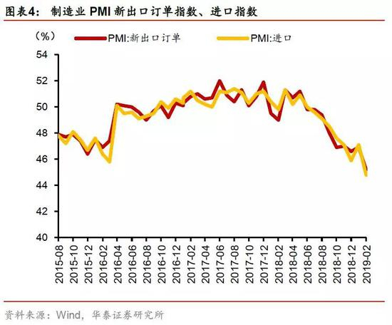 2019年2月中采制造业PMI降0.3个百分点至49.2%,虽然存在一定春节因素扰动,但生产指数回落1.4个百分点至49.5%,是自2009年2月以来PMI首次跌破荣枯线,本月也是综合指数连续3个月处于收缩区间,体现经济下行压力加大。2月新订单指数回升1个百分点至50.6%,体现节后订单有所改善,预计3月综合指数可环比回升。2月进口和新出口订单指数继续下探,分别降2.3和1.7个百分点至44.8%和45.2%,均创2009年初以来新低。2月从业人员指数继续回落0.3个百分点至47.5%。