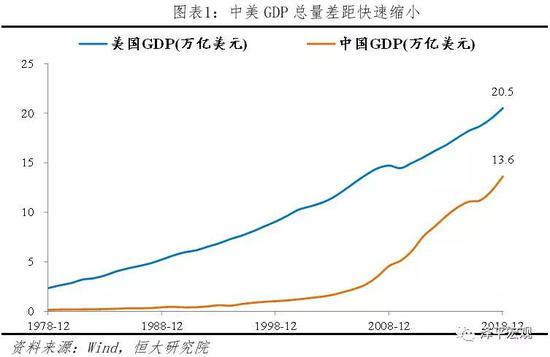 2018年中国GDP规模达90万亿元,相当于13.6万亿美元,为世界第二大经济体。美国2018年GDP为20.5万亿美元,中国GDP约相当于美国的66%,中美差距正在快速缩小。2018年中国GDP实际增速6.6%,低于1978-2008年高速增长期的平均增速9.8%,但仍远高于美国2018年增速2.9%。据IMF估计,2018年全球GDP总量达84.8万亿美元,其中,中国和美国占全球GDP比重分别为16.1%和24.2%,第三大经济体日本占全球GDP比重仅5.9%,中美主导全球。
